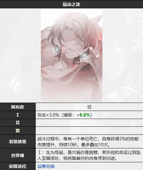 《无期迷途》殒命之途烙印在战斗过程中,每有一个单位死亡,自身获得3%的技能伤害提升,持续10秒。最多叠加10次。接下来就由小编给大家带来了详细的《无期迷途》殒命之途烙印图鉴,希望这篇文章可以帮到大家!