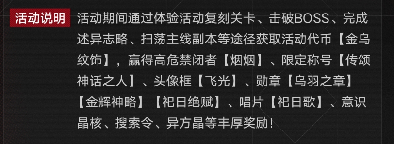 在活动期间内,玩家可以通过完成活动中的复刻关卡、击破BOSS、完成述异志略、扫荡主线副本等方法,去获得活动代币【金乌纹饰】。