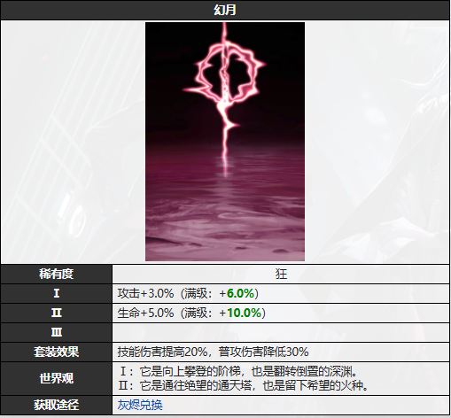 《无期迷途》中的幻月烙印在战斗中会使携带幻月烙印的禁闭者角色获得技能伤害提高20%,普攻伤害降低30%。接下来就由小编给大家带来了详细的《无期迷途》幻月烙印图鉴,希望这篇文章可以帮到大家,大家一起来看看吧!