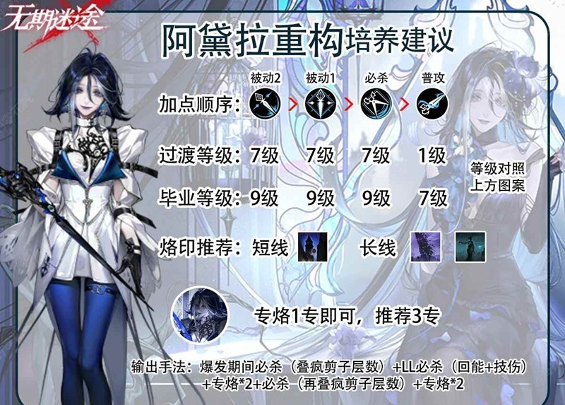 技能先被动2提升爆伤,再升被动1提升暴击,最后提升大招倍率,烙印短线依旧是钟楼,长线则推荐高塔审判,自身技能+锚点+烙印已经能做到92%暴击,配合耶莱娜就能做到常驻100%暴击
