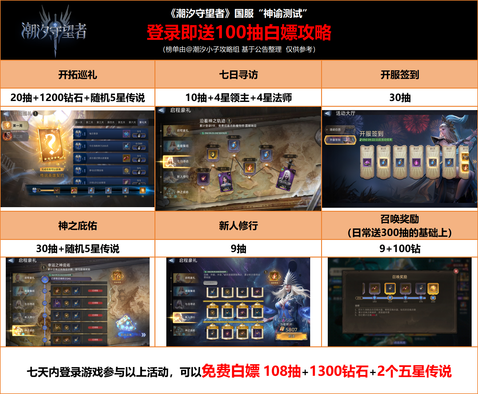 潮汐守望者国服迎来测试,想必各位指挥官已经进入泰亚之地开始征程了。当然必不可少的是官方送出的一些个福利,稍微总结了一下,大概有100抽的福利,下面就是这《潮汐守望者》100抽白嫖福利攻略,大家行动起来吧!