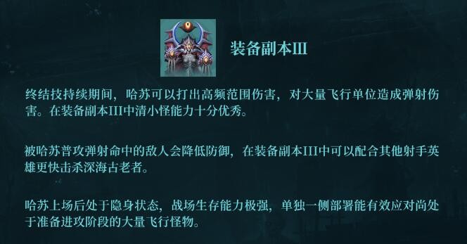被哈苏普攻弹射命中的敌人会降低防御,在装备副本III中可以配合其他射手英雄更快击杀深海古老者。