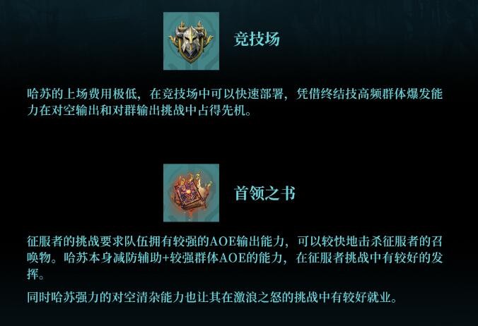 征服者的挑战要求队伍拥有较强的AOE输出能力,可以较快地击杀征服者的召唤物。哈苏本身减防辅助+较强群体AOE的能力,在征服者挑战中有较好的发挥。