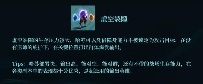 虚空裂隙的生存压力较大,哈苏可以凭借隐身能力不被锁定为攻击目标,在没有医师的庇护下,在关键位置打出群体爆发输出。