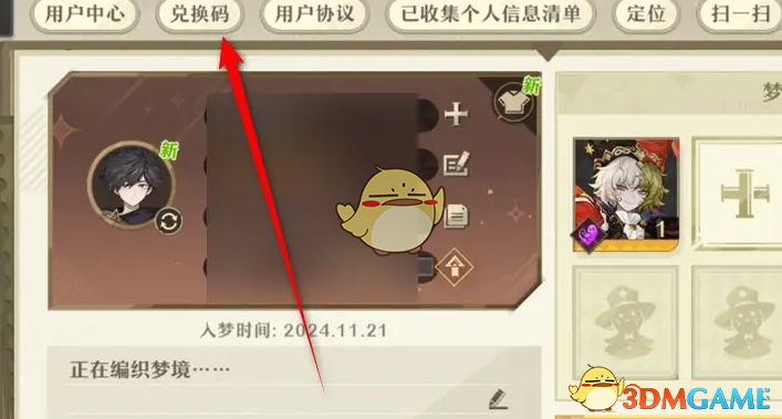 3、进入个人信息页面后,点击上方导航栏处的兑换码选项