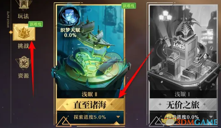 2、进入关卡后点击左侧的挑战,选择一个挑战章节进入其中