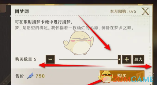 4、选择购买数量,点击购买完成支付即可获得圆梦网,可在限时捕梦卡池进行捕梦。