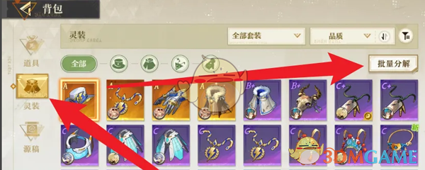 3、接着在背包页面,点击灵装,选择右侧的批量分解;