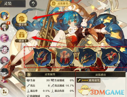 4、点击一键穿戴即可为梦灵穿戴灵装,之后在右下角点击一键卸下即可为梦灵卸装。