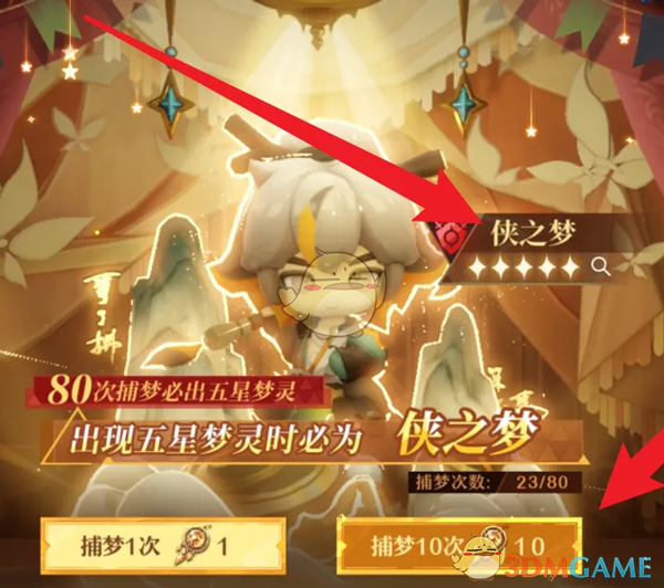 3、最后在侠之梦的捕梦页面,捕梦就有概率获取,保底80次必出;