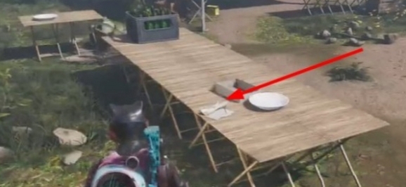 4、到达下图所示的木桌子附近后,靠近桌子点击交互键即可获得熏肉罗宋汤食谱。