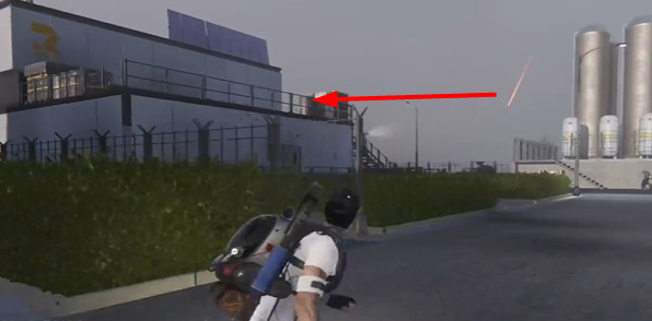 2、来到下图可以在左侧看到厂房建筑,然后顺着建筑楼梯来到房顶位置