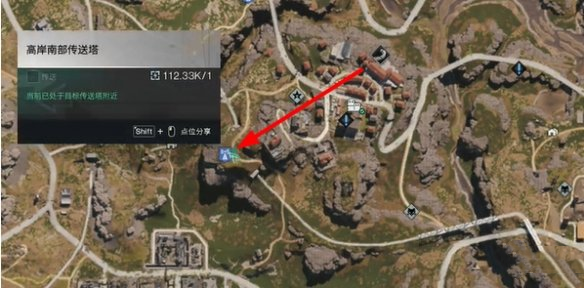 1、首先玩家打开地图前往高岸镇左下角传送塔。