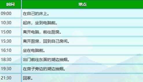 答:15:00离开自己的房间,18:30-19:30出房间在湖边待着。