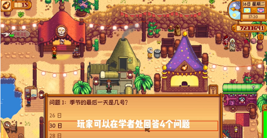 星露谷物语中沙漠节日是1.6版本新增区域,玩家们可以与学者对话回答四个问题,需要注意题目是随机的,全部回答正确即可获得卡利科三花蛋奖励,接下来小编就为大家带来详细的《星露谷物语》沙漠节日问题答案大全,有需要的自行查看吧。