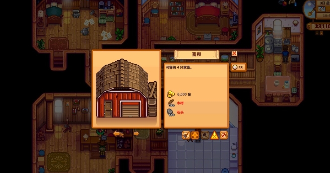 2、建造高级畜棚:前往罗宾家建造高级畜棚,解锁绵羊购买界面。高级畜棚拥有自动喂食功能,多建几个筒仓储存干草保证自动喂食。