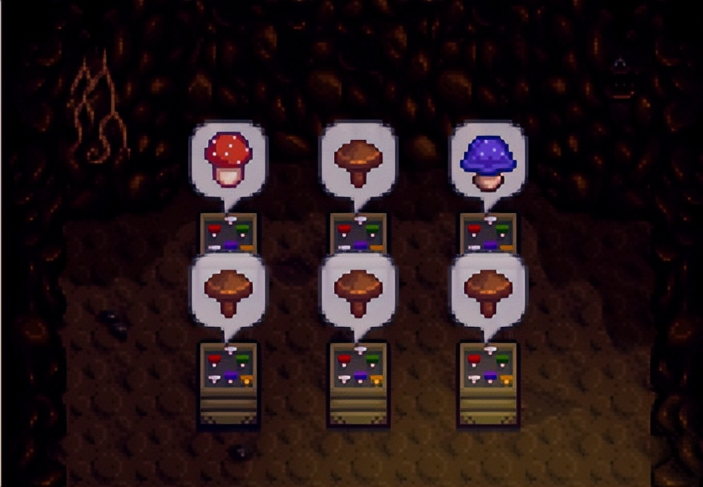 选择蘑菇山洞后,山洞中会固定添加六个方的箱子,里面每两天会产生六个蘑菇,山洞中生长的蘑菇的品质也只会是普通的,不像下矿可以获得金星品质。配合山洞中给的烘干机,可以获得稳定收入。