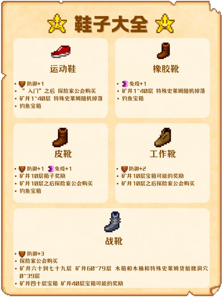 矿井/地牢宝箱:许多鞋子在特定层数的矿井、骷髅洞穴或火山地牢中,由宝箱掉落。