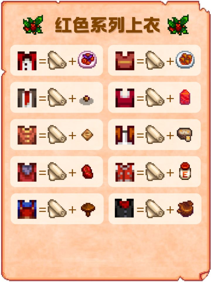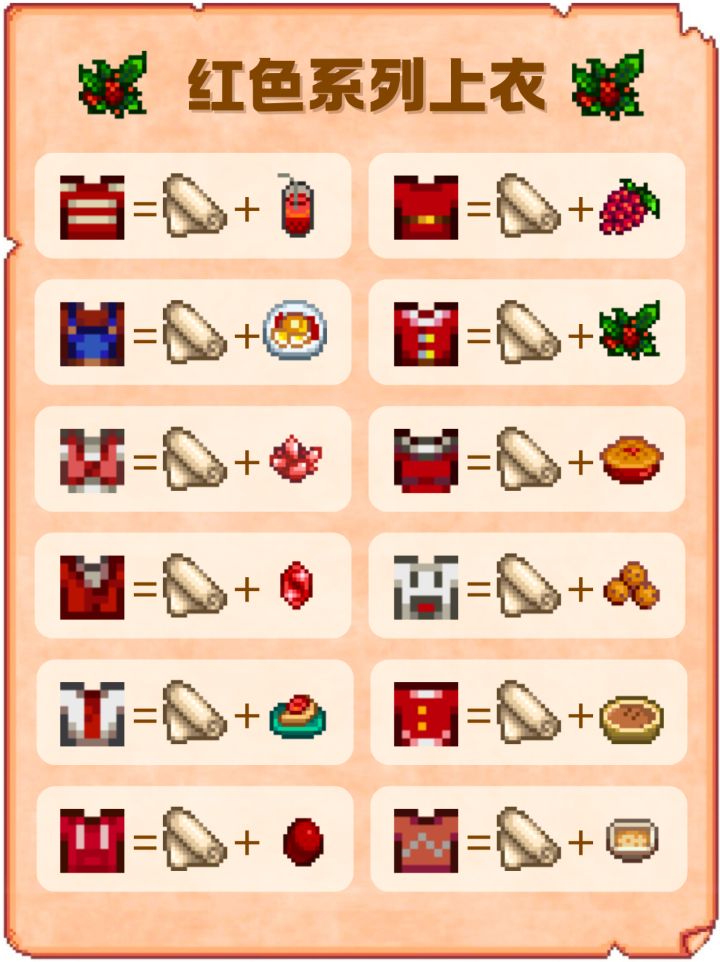 星露谷物语红色上衣有哪些,红色系列上衣主要通过布料基底 + 特定染色材料在缝纫机中制作,这期整理了一些红色的上衣配方共22种,以下是红色系上衣的配方清单。