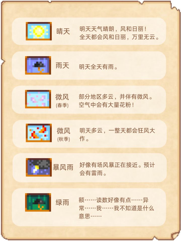 星露谷物语中有哪些天气,星露谷一共有9种天气:晴天,雨天,微风(春季),微风(秋季),暴风雨,绿雨,下雪,节日,婚礼,希望这篇笔记可以帮助老乡们更好的体验不同天气带来的乐趣。
