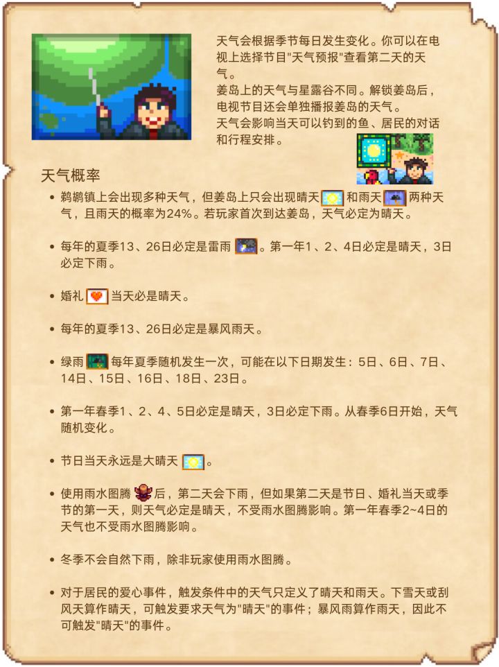 这篇笔记分别介绍了电视上天气预报的9种情况,姜岛的天气和星露谷的不同,解锁姜岛后天气预报还会单独播报姜岛的天气。
