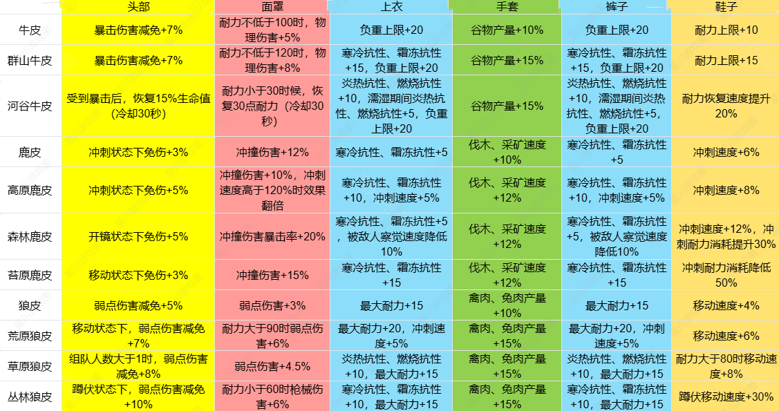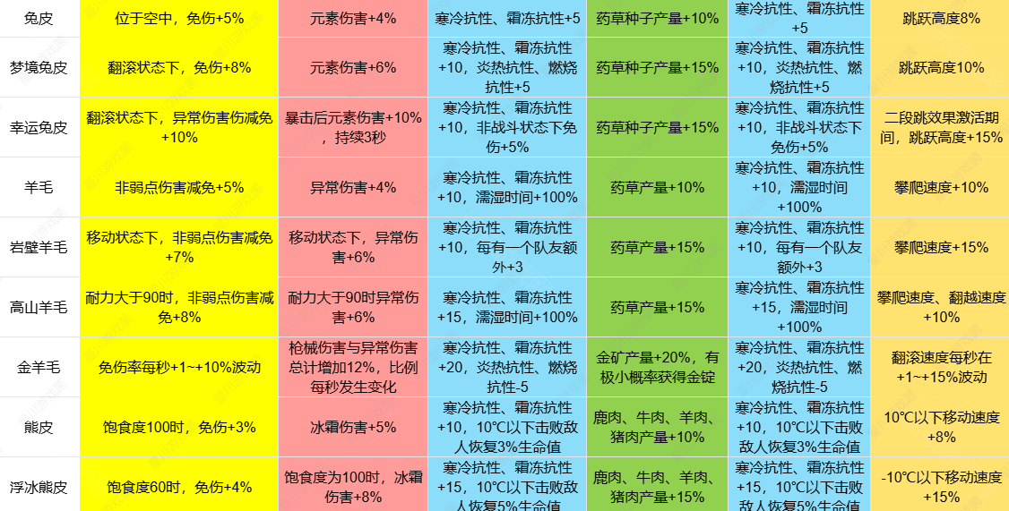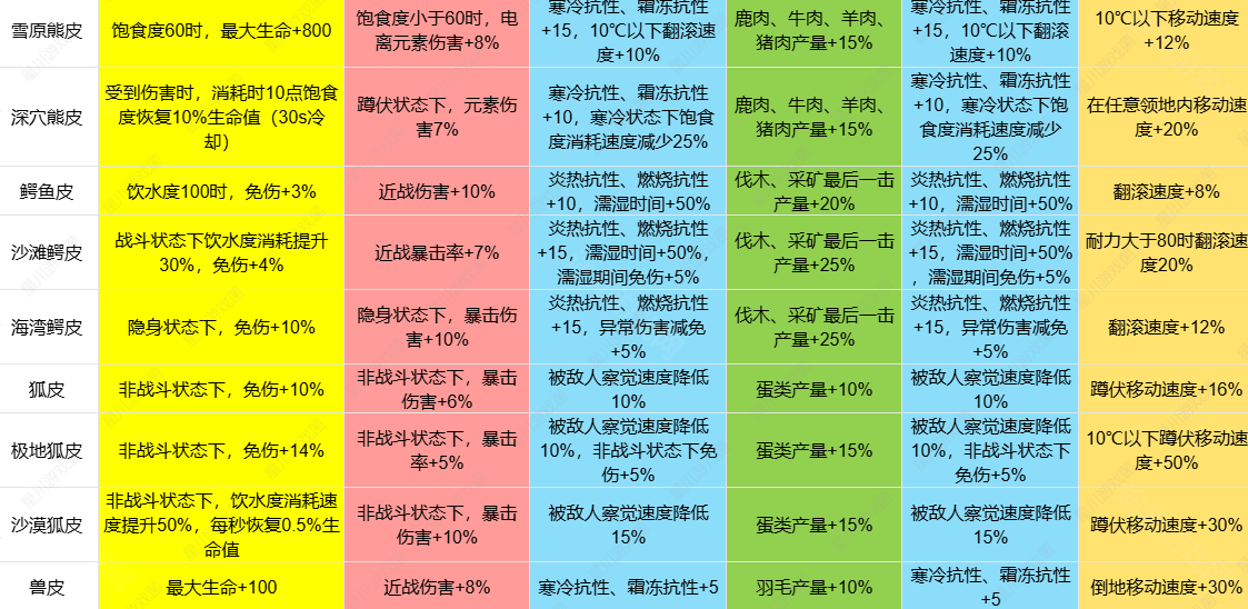 2、如海豹皮适合低温抗性,鳄鱼皮带有高温抗性,可以帮助角色适应极寒或极热的环境;