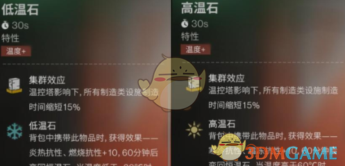 解锁模因并烧20个炭制作恒温石,使用恒温石和炭合成高温石,可增加10点抗寒值。