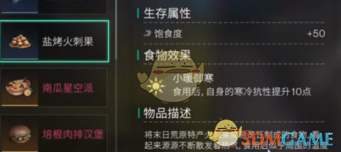 食用特定食物,如烤火刺果可提升抗寒能力。不仅可以提高抗寒能力,还能减缓寒冷环境对角色状态的影响。