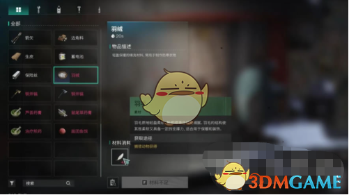 3、成功猎杀鸟类即可概率获取到羽毛或禽肉,收集到一定数量的羽毛就可以制作羽绒了。