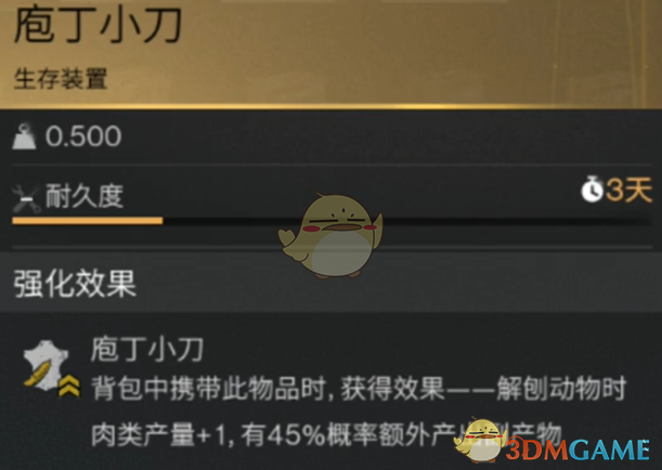 庖丁小刀是七日世界游戏中的特殊道具,当背包中携带此道具时,能够获得特殊效果,在解刨动物的时候,肉类产量有所增加,且45%的概率额外产出副产物,那么庖丁小刀要如何获取呢?下面小编整理了《七日世界》庖丁小刀获取方法介绍,一起看看吧。
