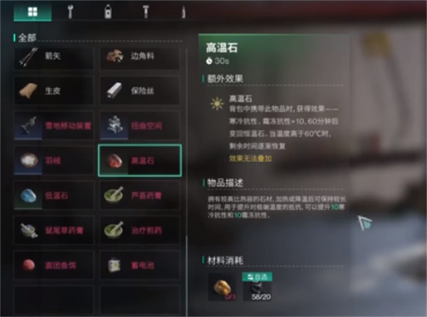 高温石是通过烧制炭并解锁模因来制作的。首先,烧制20个炭,并制作恒温石,然后将恒温石与炭结合即可合成高温石。使用高温石可提升10点抗寒值,帮助在寒冷环境中生存更长时间。