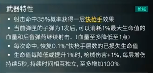 2、并且在弹匣的子弹为1是,可以消耗1%最大的生命值和后备弹药继续射击,搭配快枪手层数的回血。