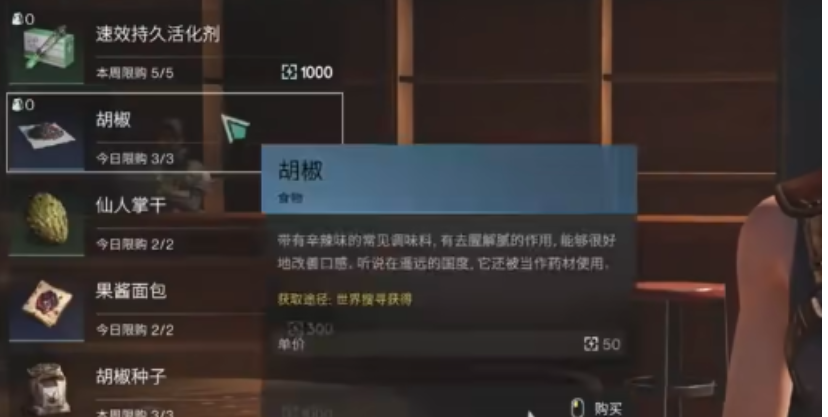 胡椒在游戏中是一种极为重要的香料,在很多食物里面都需要用到它,为此玩家需要经常在背包中准备一些胡椒,胡椒的获取方法主要可以通过偷取和购买获得。