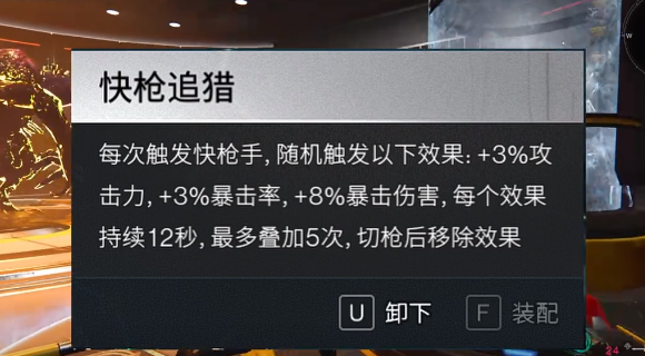 拥有快枪手的特性,每一次在击中敌人时就会有40%的几率可以触发这一个特性效果。在触发之后,攻击的速度还有子弹的发射速度全部都会有所提升。在击中同一个目标时,累积的次数达到5次,此时猎食者马上就会进入到自但无限的状态。