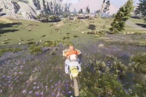 2、骑上摩托车,朝着平原上的村庄跑过去。