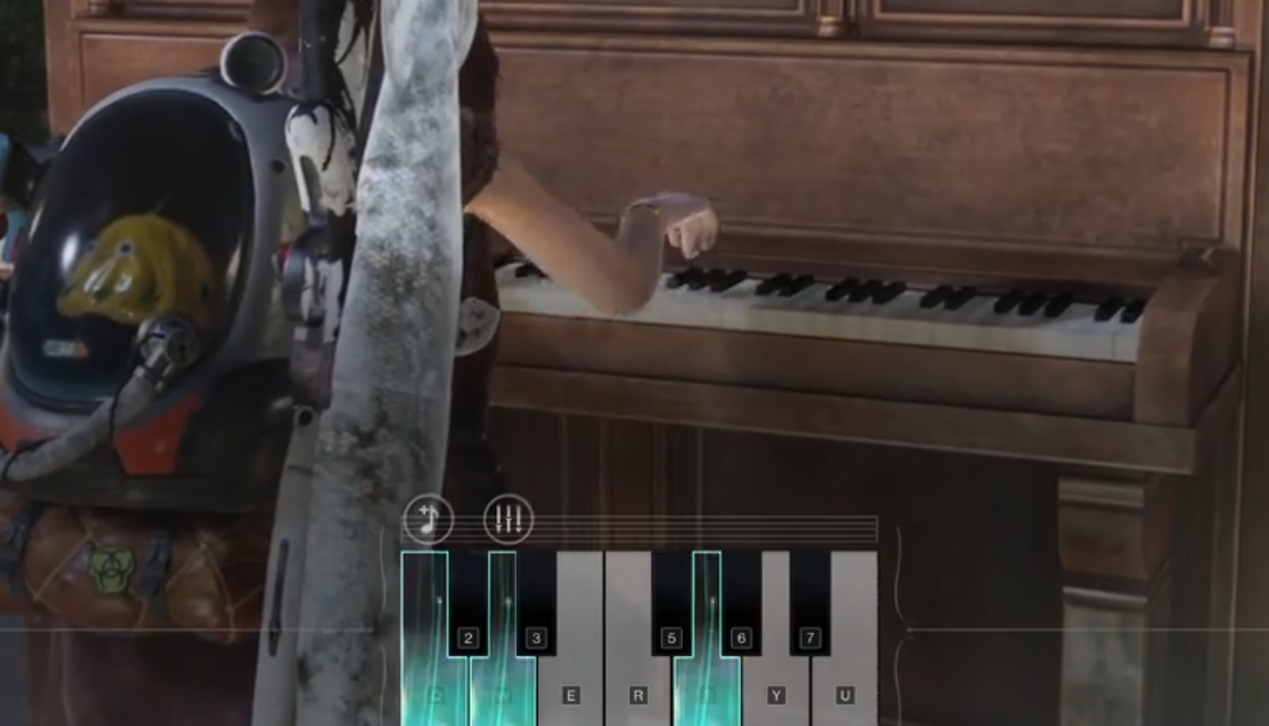 分别是qwertyu和23567,按动它们就会出现对应的音调,本身就懂弹琴音调的可以试着弹奏一些有节奏的曲子,不懂的玩家可以随便弹一弹,这个更多的只是娱乐,主要是给大家在末世中带来一定温馨氛围。