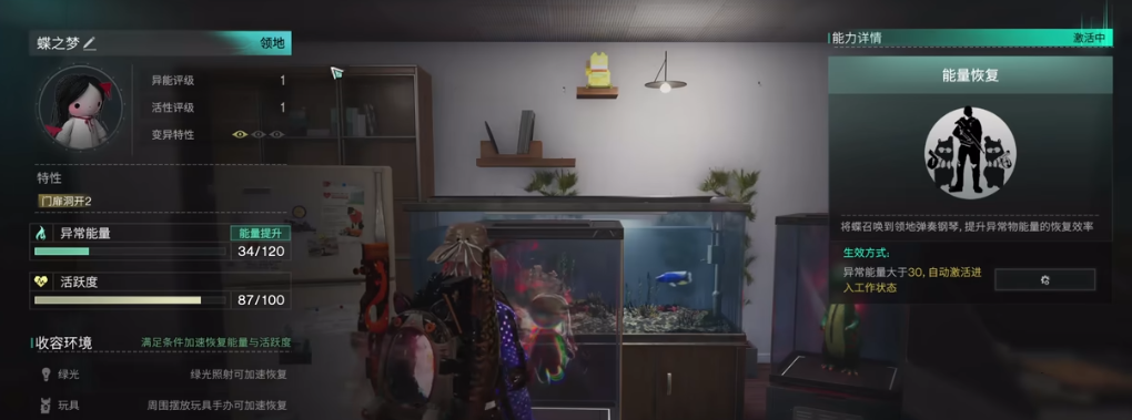 站在对应属性罐子内顺利击杀后,就可以收容到蝶之梦了,此后我们在家中对其召唤,就会有少女蝶出现弹奏钢琴,提升异常物能量回复效率,我们如果想要自己弹奏的话,靠近钢琴能看到下图中这样不同的按键。