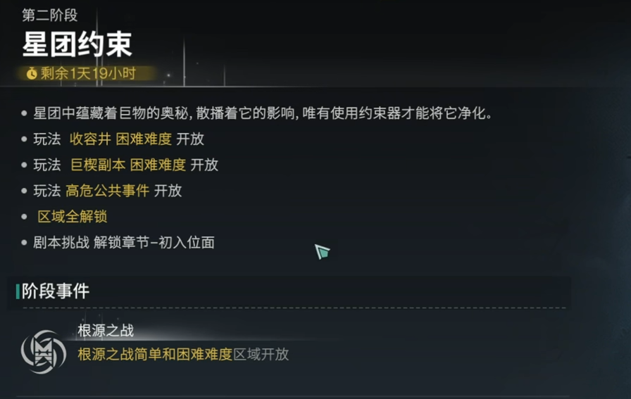 二阶段的为期则是6天,这个阶段将会开放困难的收容井,巨楔和一些高危的公共事件。同时根源之战将会开启简单和困难难度的玩法。玩家们可以通过参与根源之战来获取赛季奖励。