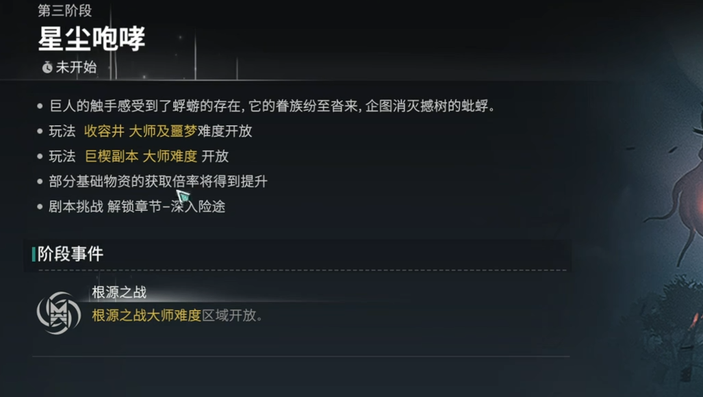 三阶段收容井将会开放大师以及噩梦难度。巨楔则是开放大师难度。同时根源也会开放大师难度。部分基础物资的倍率将会提升。为期14天。四阶段会开放天空之触的入侵。本阶段主要需要完成全服进度,这样可以获得额外的星彩宝箱奖励。