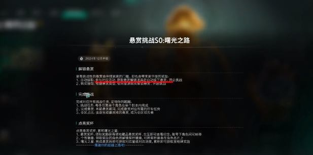 但目前阶段其他的免费选项并不是很多,玩家可以保持耐心等候。可以点击游戏左上角的曙光之路,上面就会有提示,而且悬赏挑战也会持续的更新。后续一段时间内可能就会有其他的悬赏挑战项目,也可能会有其他的免费活动,到时候大家都可以去参与。