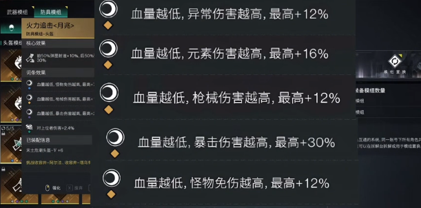 月兆后缀模组一般只是作用于上身防具或者是头盔。主要的优点就在于玩家的生命值越低,那么获得的收益也就越高。这一个模组就会有5条专属词条,当生命值在下降到30%之后,就可以发挥比较大的效率。