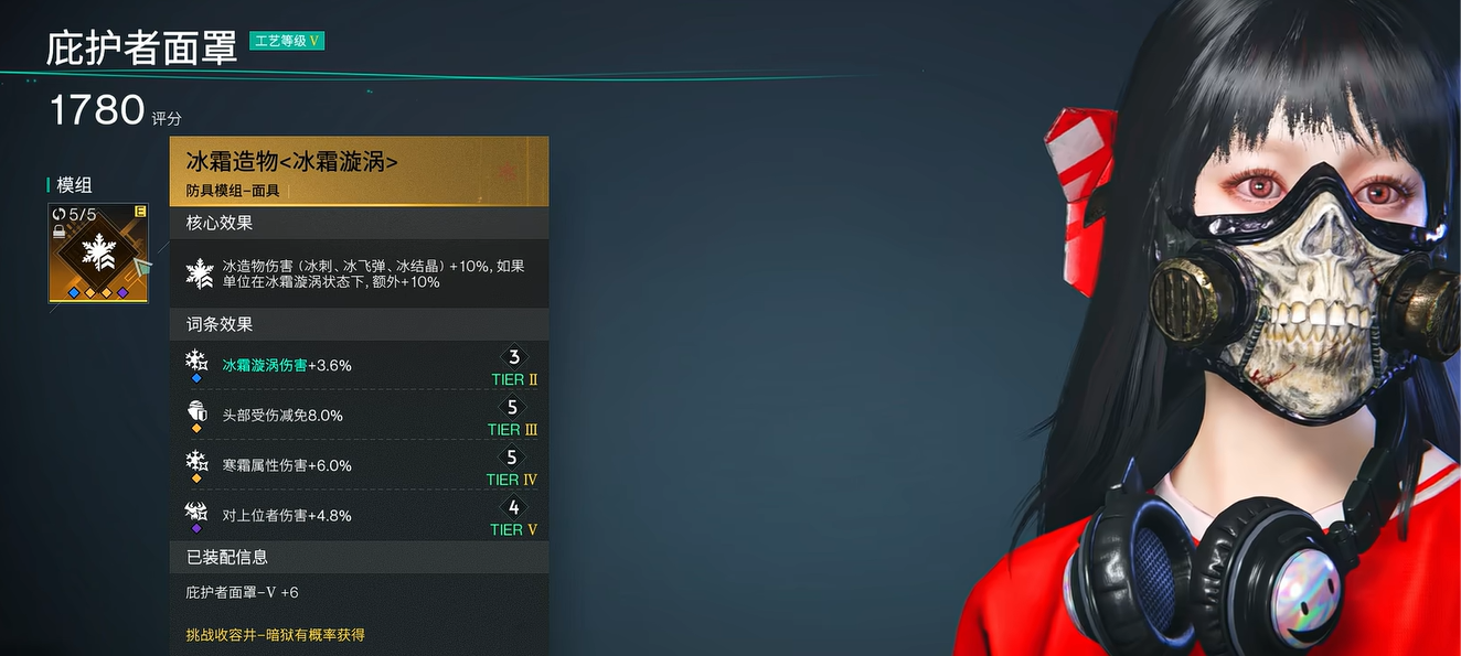 头部模组选择异常强化,可以增加10%的射速和20%的异常伤害加成,这时就可以将大家的射速提升至825。这已经是非常够用了,所以后面的图纸就不需要再带射速。面罩模组可以用冰霜造物,可以给冰晶飞弹增伤;如果敌方在冰霜漩涡里面,再额外加10%的伤害。