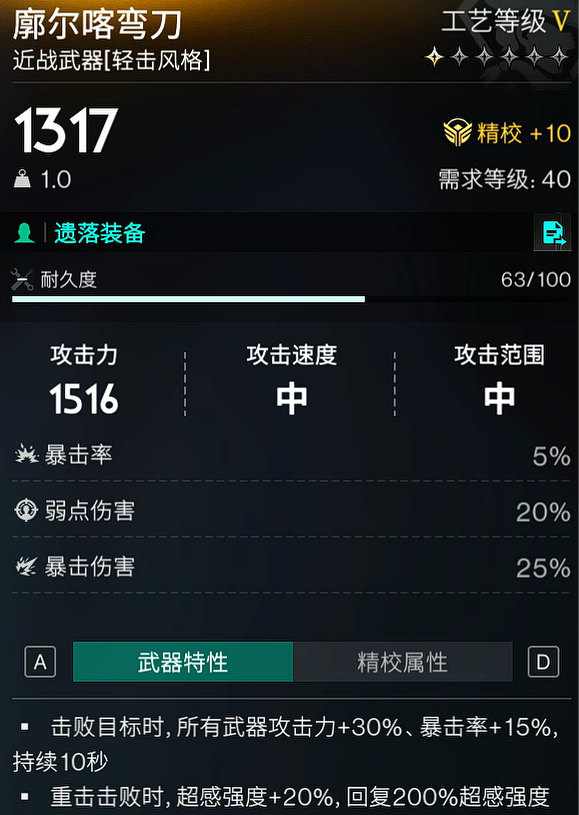 副武器推荐大家用廓尔喀弯刀,作为一柄轻击风格的近战武器,重击砍碎冰块的效果,可以给大家带来30%的易伤效果,进一步增加静默归途的输出伤害。另外还能提升20%的超感,更加容易打出碎冰等元素伤害。
