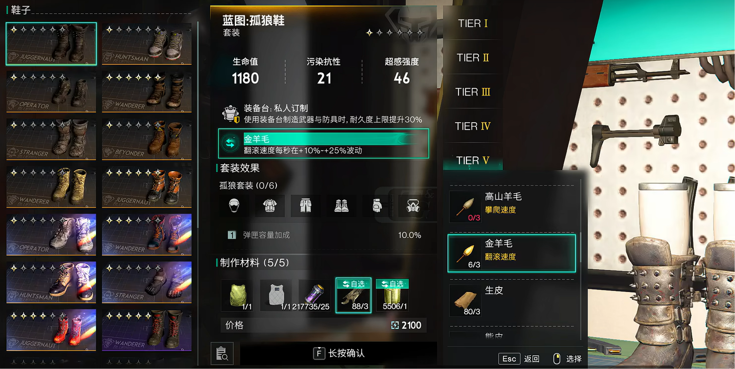 鞋子模组建议使用金羊毛加翻滚速度,因为后面移速和冲刺其实不是很缺;但是如果不翻滚的话,那就可以继续用荒原狼皮,其他部位任意皮毛即可。枪上面的模组有两个选择,分别是冰霜守护和多重陷阱。冰霜守护的效果是:每次漩涡消失时,就可以恢复10%的生命值。