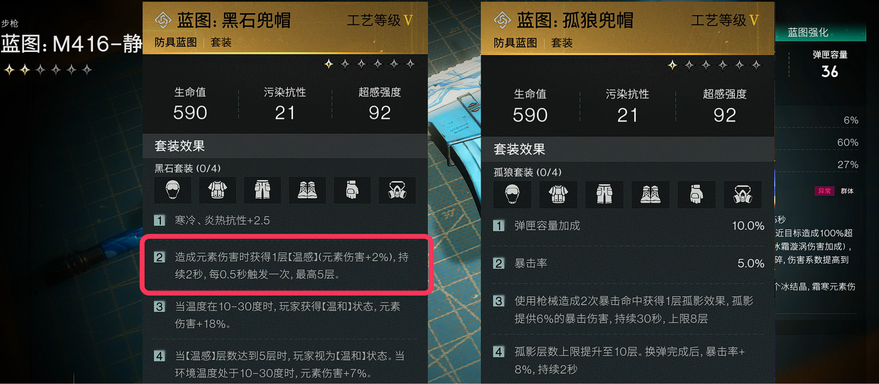 这里推荐大家直接用黑石四件套,套装效果的话,可以提升35%元素伤害,增强极端天气抗性。黑石面罩可以延长冰霜持续时间,也可以用孤狼面罩替代,+10%弹匣容量;接着可以用黑石上衣(提升异常伤害)或判客外套(+15%换弹速度),裤子则可精准充能(弱点命中率提升元素伤害)。