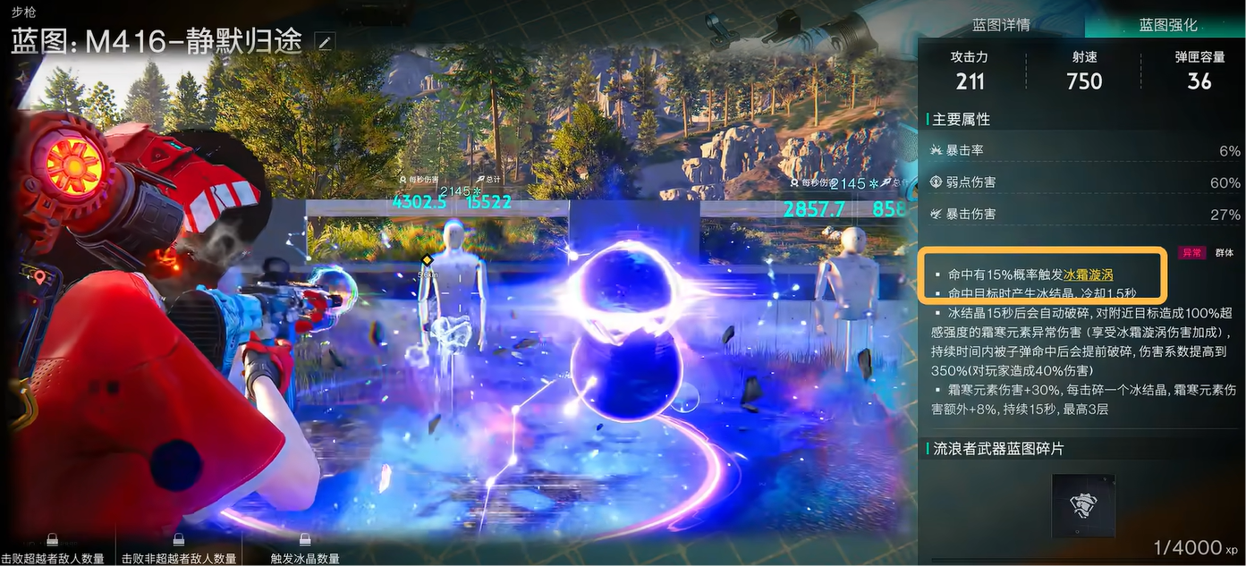 这把武器的特性叫做冰霜旋涡,命中敌人有10%概率触发冰霜旋涡,持续造成寒霜伤害。第二个特性可以造成冰结晶,并且在15秒后自动破碎,造成额外伤害,若被提前击碎则伤害提升300%。第三个则是寒霜增伤:每击碎一个冰结晶,寒霜伤害额外提升10%,最高叠加4层。