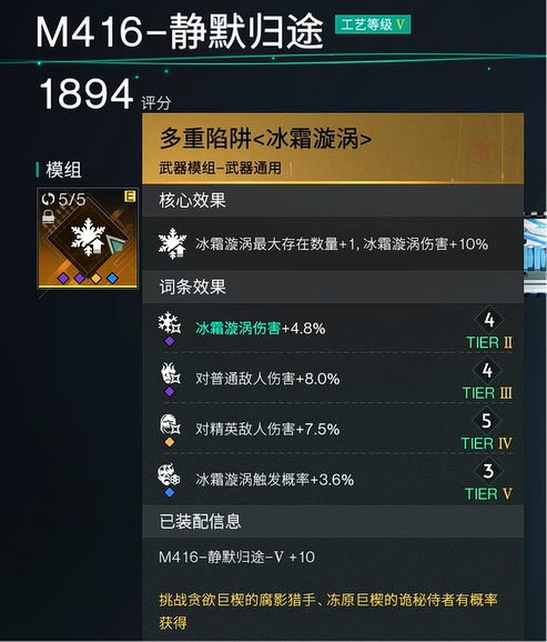 多重陷阱的话,这个模组可以让冰霜漩涡存在加一,可以同时存在三个漩涡。主要能让冰霜漩涡伤害加10%,主要是这个冰霜漩涡伤害,可以让冰晶和飞弹,全部可以吃到它的伤害加成,这样输出就能拉到最大。