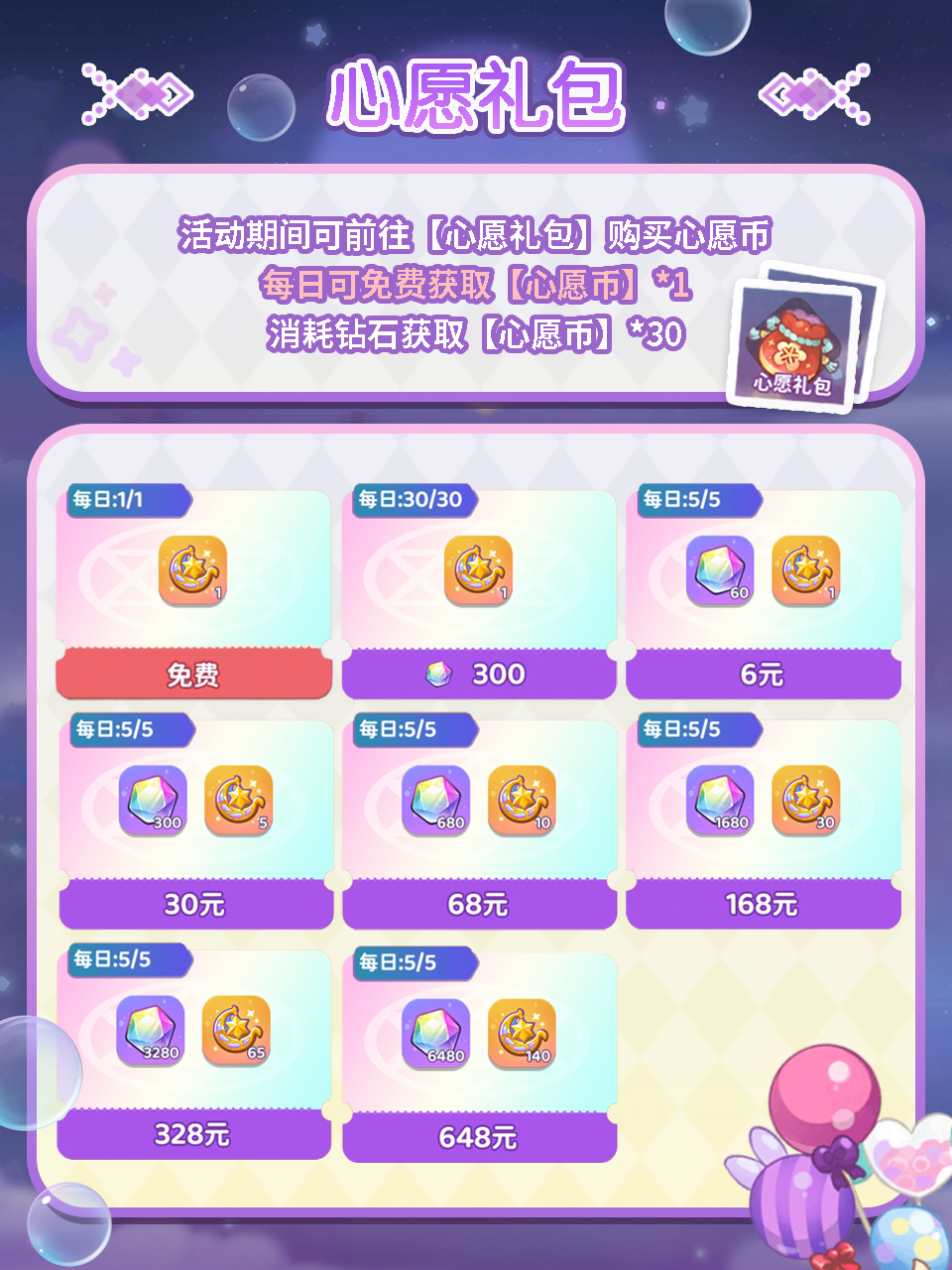 通过【心愿礼包】每日可免费获取【心愿币*1】,消耗钻石购买【心愿币*30】。