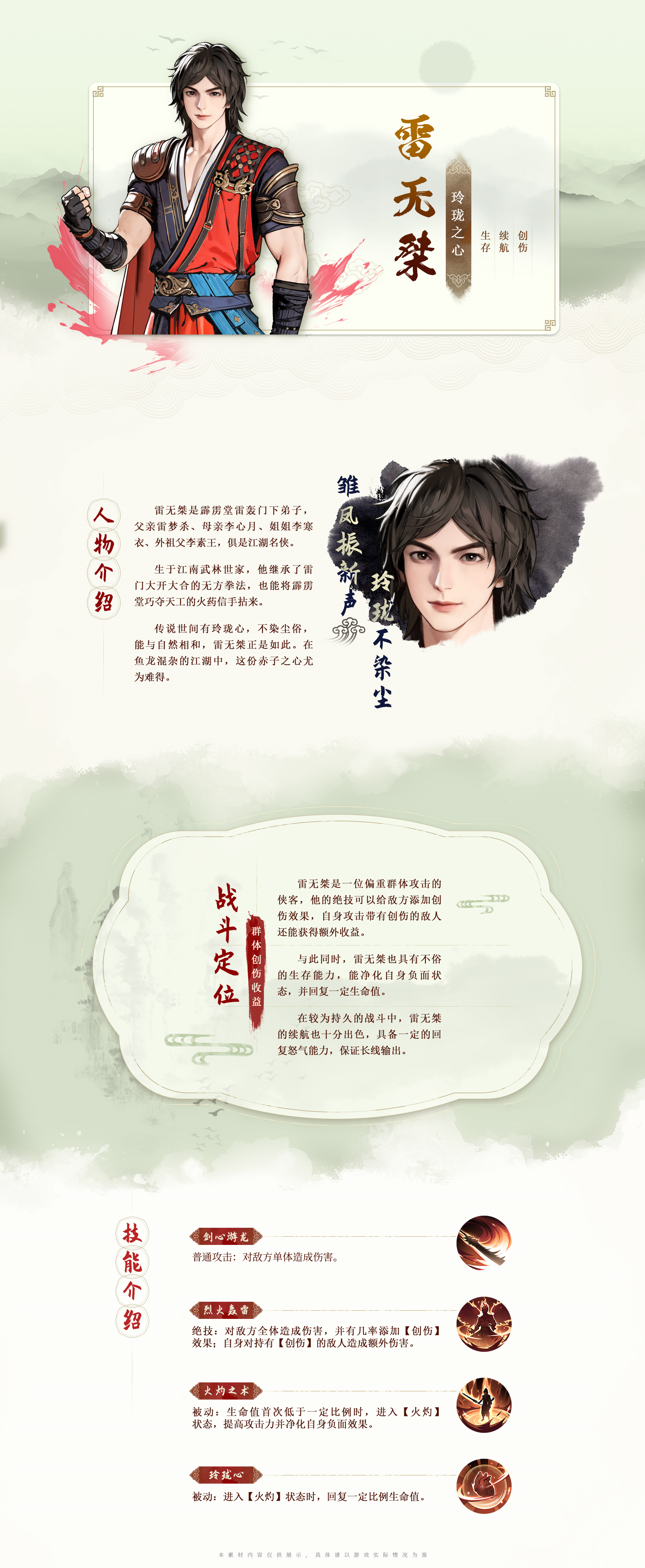 雷无桀是一位偏重群体攻击的侠客,他的绝技可以给敌方添加创伤效果,自身攻击带有创伤的敌人还能获得额外收益。