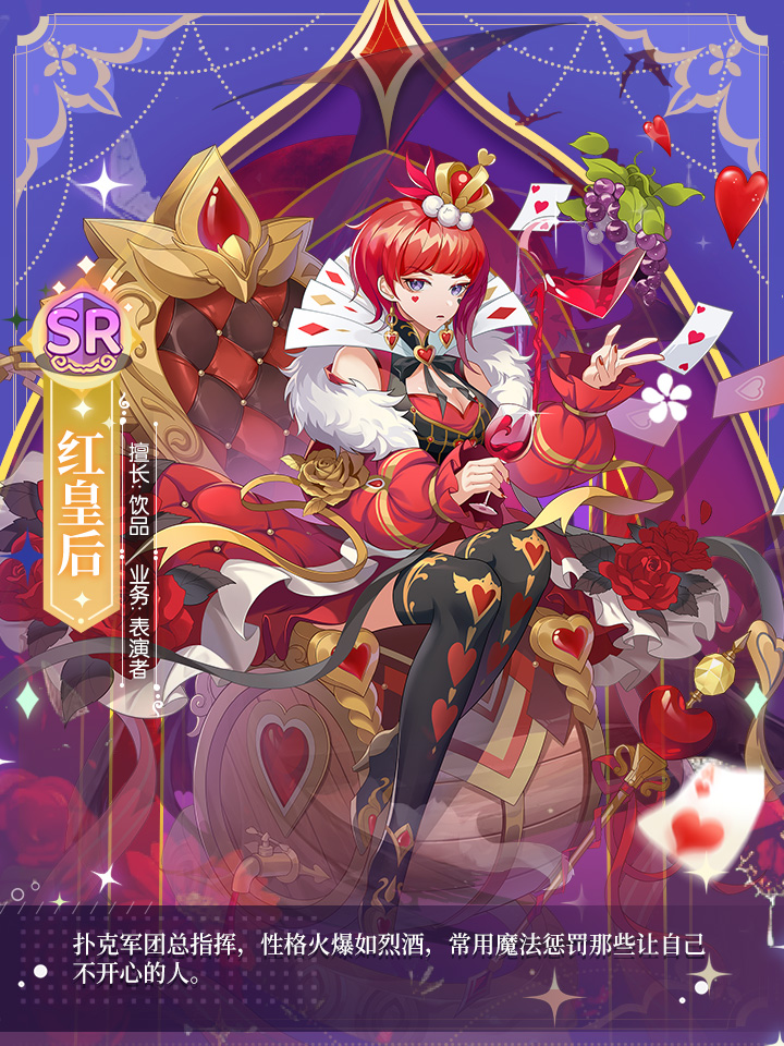 红皇后是扑克军团总指挥,性格火爆如烈酒,常用魔法惩罚那些让自己不开心的人。华丽而高贵的女王,在艺术之路上显然也颇具天赋。有时你并不知道这是战斗的冲锋号,还是她对于「表演」的吹毛求疵。接下来给大家带来了《梦境食旅》红皇后员工图鉴!